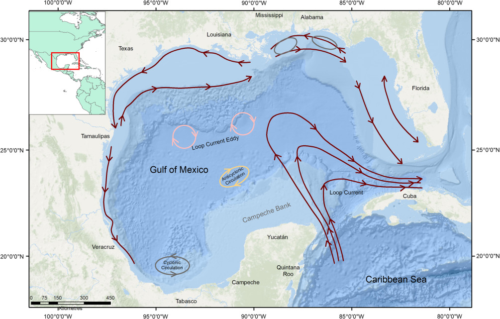 The black lines and arrows show the flow of current in the Gulf of Mexico.